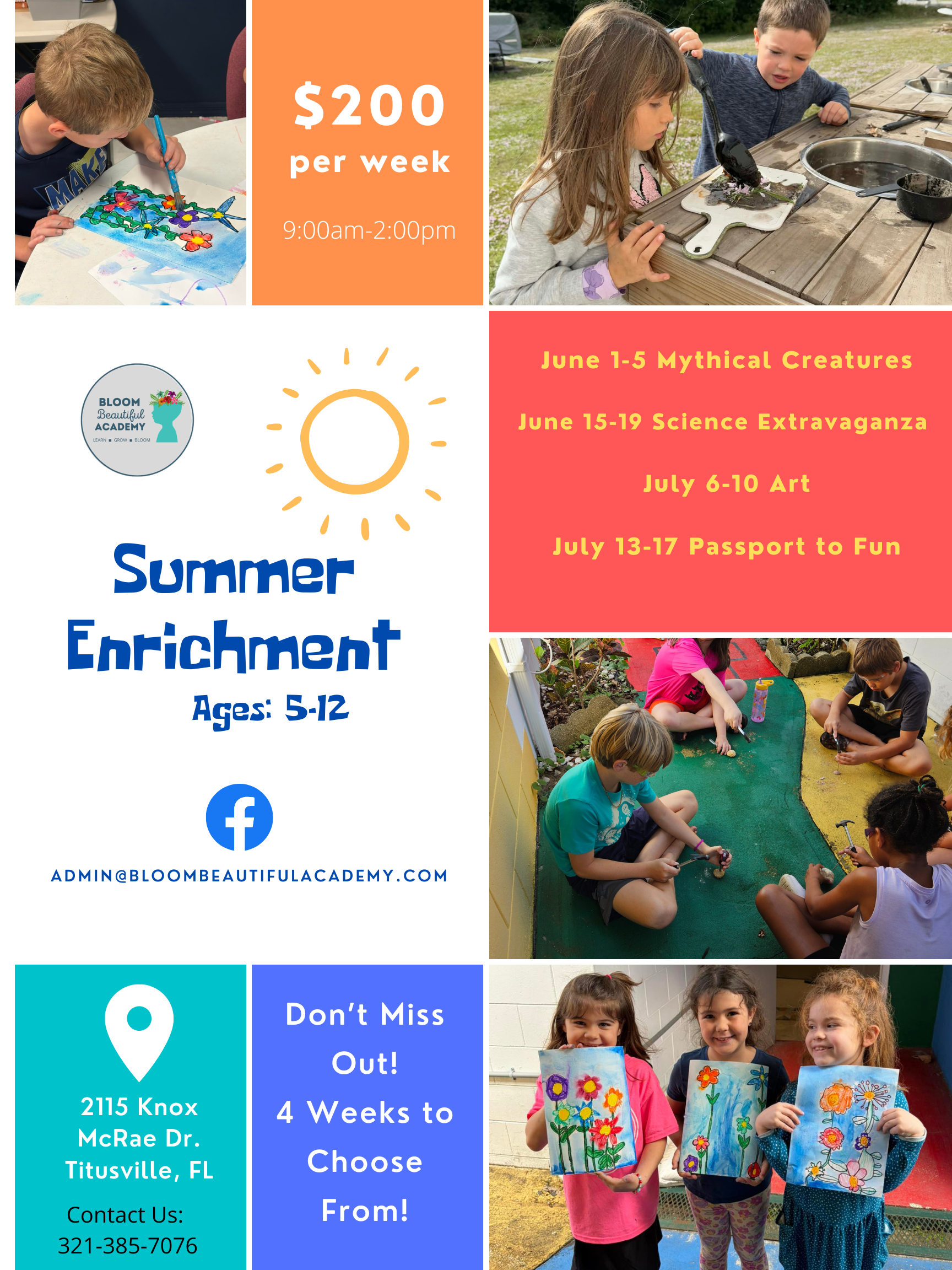 Unleash your inner artist during an action-packed week of Bloom Beautiful's Art Camp, designed for campers to explore, imagine, and create! Each day features new projects in painting, sculpting, and mixed media, allowing young creators to experiment with color and texture while building foundational skills in a fun, supportive setting. Campers will enjoy guided sessions that foster self-expression, concluding the week with a personalized portfolio of unique artwork and newfound confidence in their artistic voice.